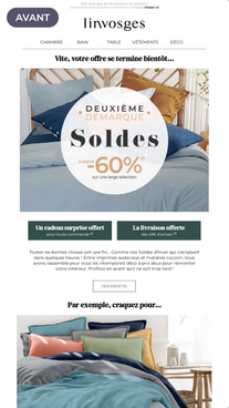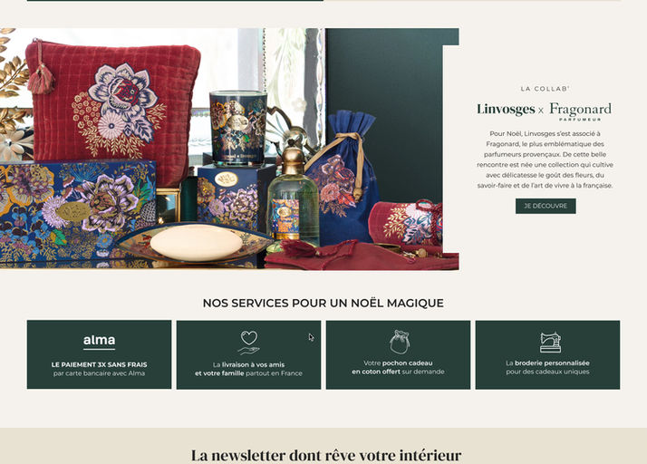 Créations de contenus web pour la marque de linge de maison Linvosges. Refonte des templates des newsletters, réalisations des homepages du site internet, mise en place de scénarios marketing en CRM et réalisation de visuels pour l'acquisition et les réseaux sociaux.